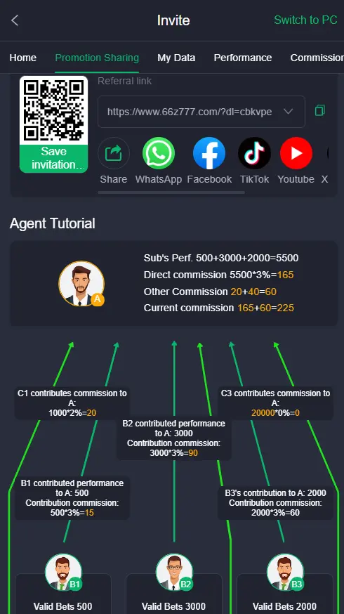 When your referrals (C1, C2, and C3) start betting, you obtain indirect commissions. If C1 bets 1000 PKR, you get 2%, which is 20 PKR. If C2 bets 2000 PKR, you receive 2%, which is 40 PKR. In total, you will get 225 PKR from your referrals. This system rewards teamwork and consistency.
