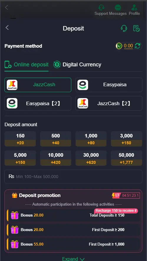The deposit and withdrawal process is simple and easy. After you create an account, you can connect your wallet to transfer money. It works with local wallets like JazzCash and Easypaisa. Below, we explain the process step by step: